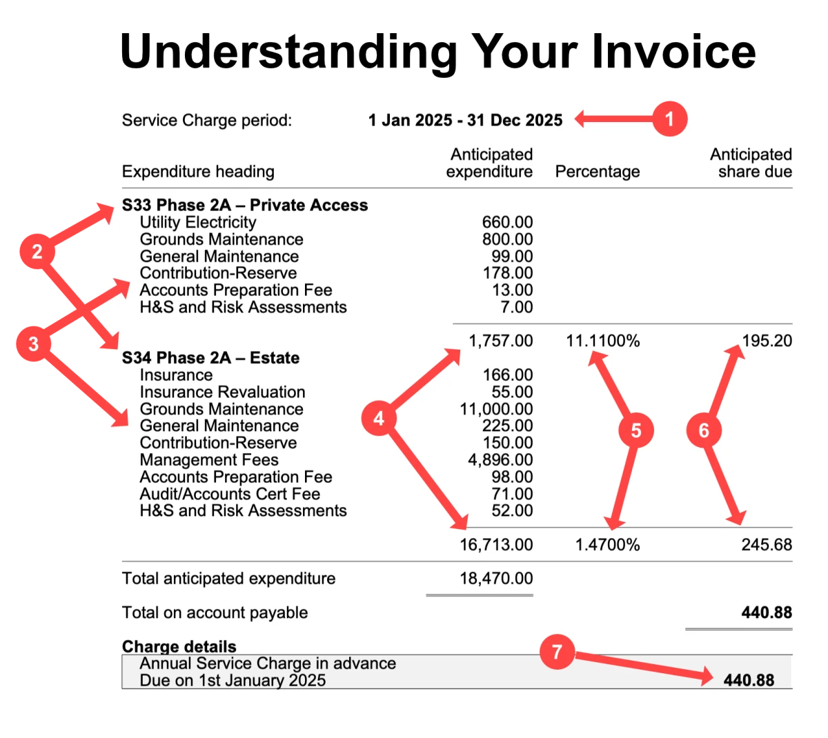 You will first need to look at your last years invoice to work out which items you pay for and how much you pay towards each section.